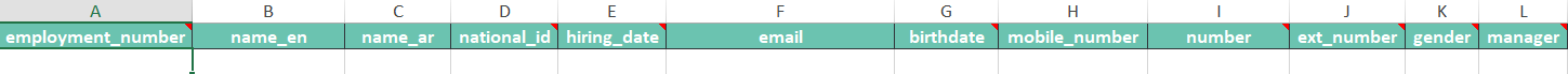 بعد تعبئة جميع الخانات في قائمة Excel نقم بحفظها ثم نقوم بالضغط مرة أخرى على خيار "استيراد الموظفين" وتحمّيل الملف ثم نضغط على "أورد بيانات الموظفين" ليتم إدخال كافة معلومات الموظفين الجدد.