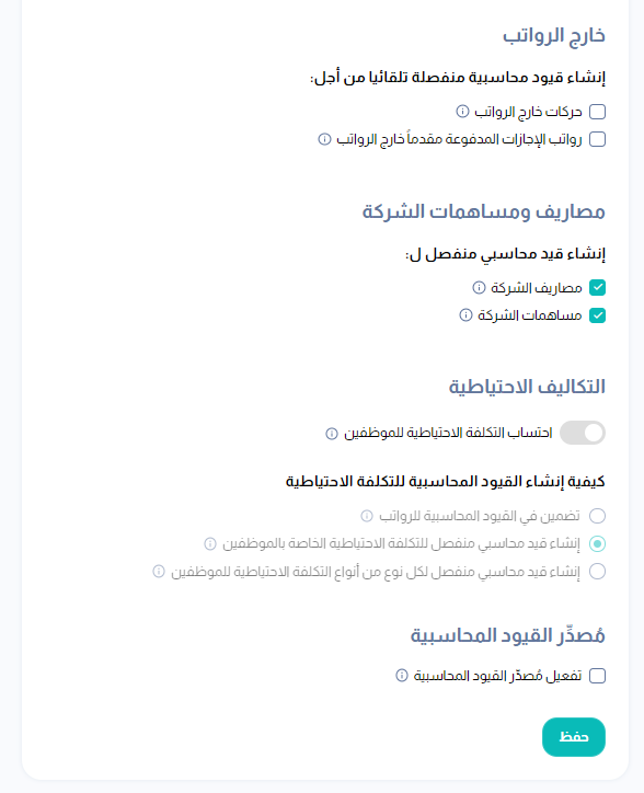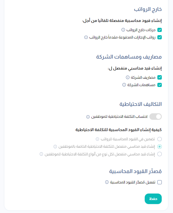 فعّل مربع الاختيار "إنشاء قيود محاسبية منفصلة من أجل حركات خارج الرواتب" ثم انقر الزر "حفظ"'.
