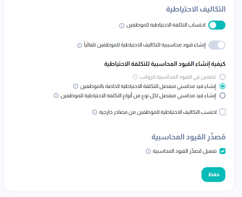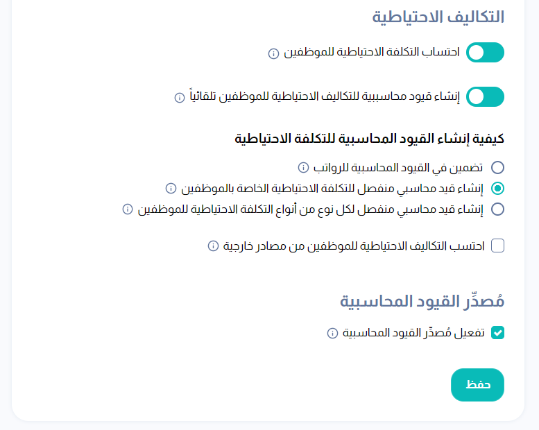 قم بتفعيل خيار إنشاء قيود محاسبية للتكاليف الاحتياطية للموظفين تلقائياً.