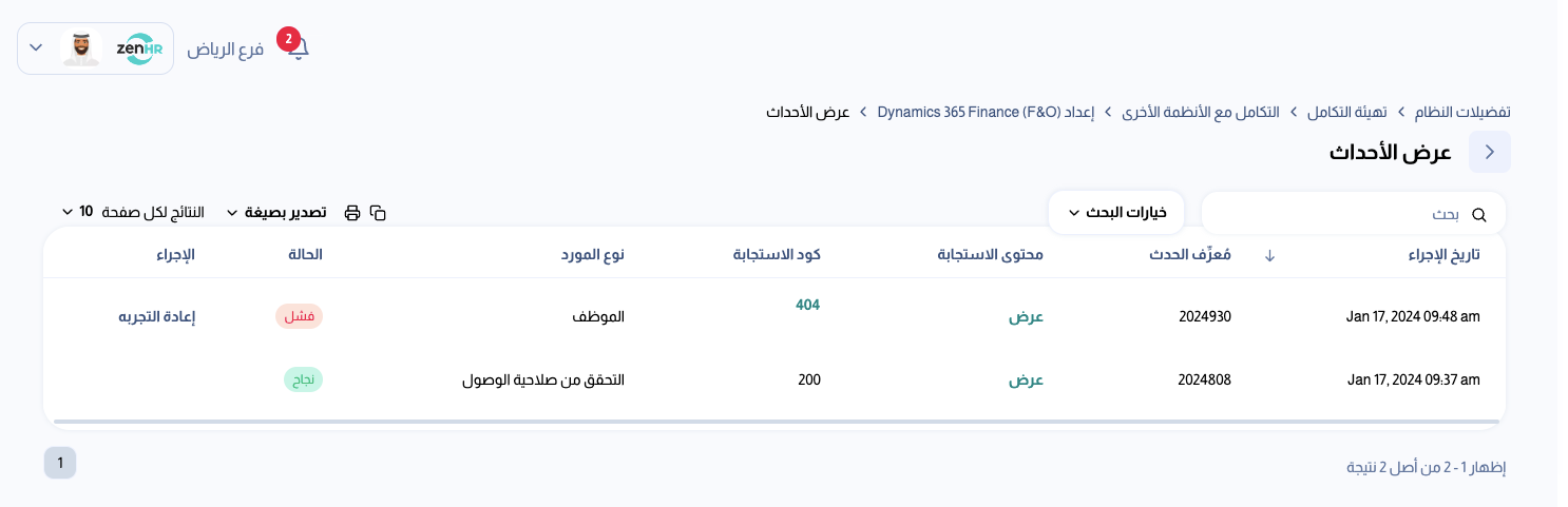 لعرض كافة الأحداث وإعادة محاولة إرسال الترحيلات الفاشلة، انتقل إلى قائمة المستخدم ← تفضيلات النظام ← تهيئة التكامل ← االتكامل مع الأنظمة الأخرى ← إعداد Dynamics 365 Finance & Operations