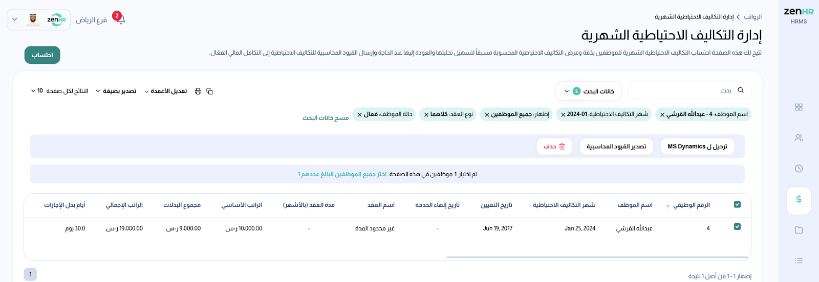 ثم انقر "ترحيل إلى MS Dynamics"، وسيتم ترحيل حركات خارج الرواتب كقيود محاسبية.