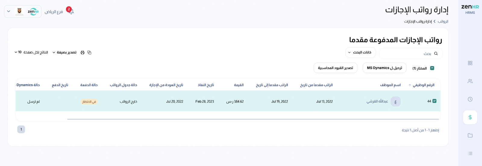 ثم انقر على "ترحيل ل MS Dynamics"، وسيتم ترحيل الرواتب كقيود محاسبية.