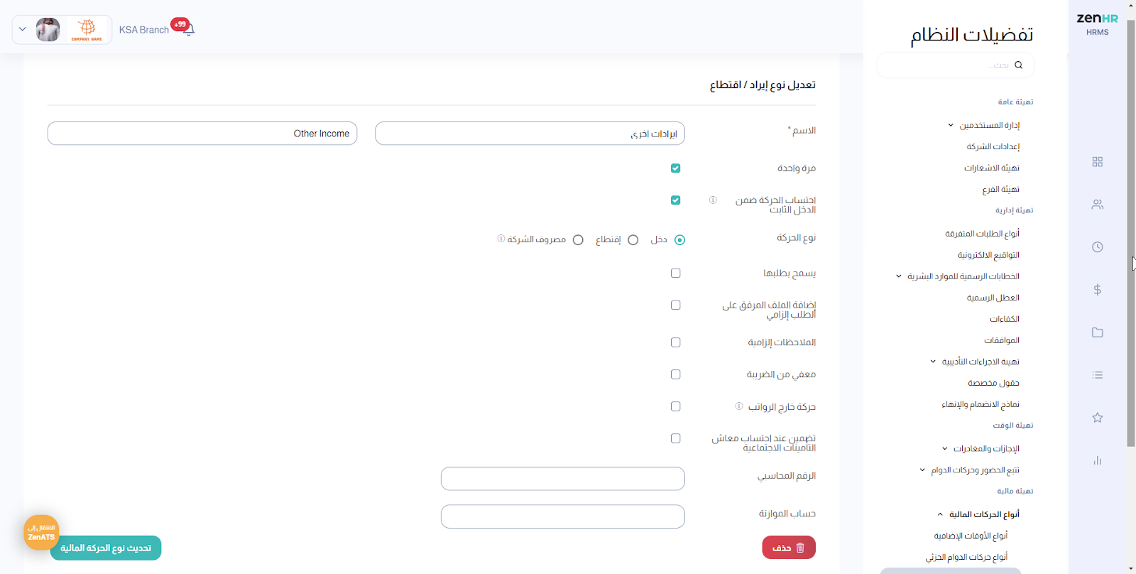 انقر قائمة المستخدم الخاص بك في الزاوية اليسرى العليا وانتقل إلى تفضيلات النظام ← التهيئة المالية ← أنواع الحركات المالية ← الإيرادات والاقتطاعات.