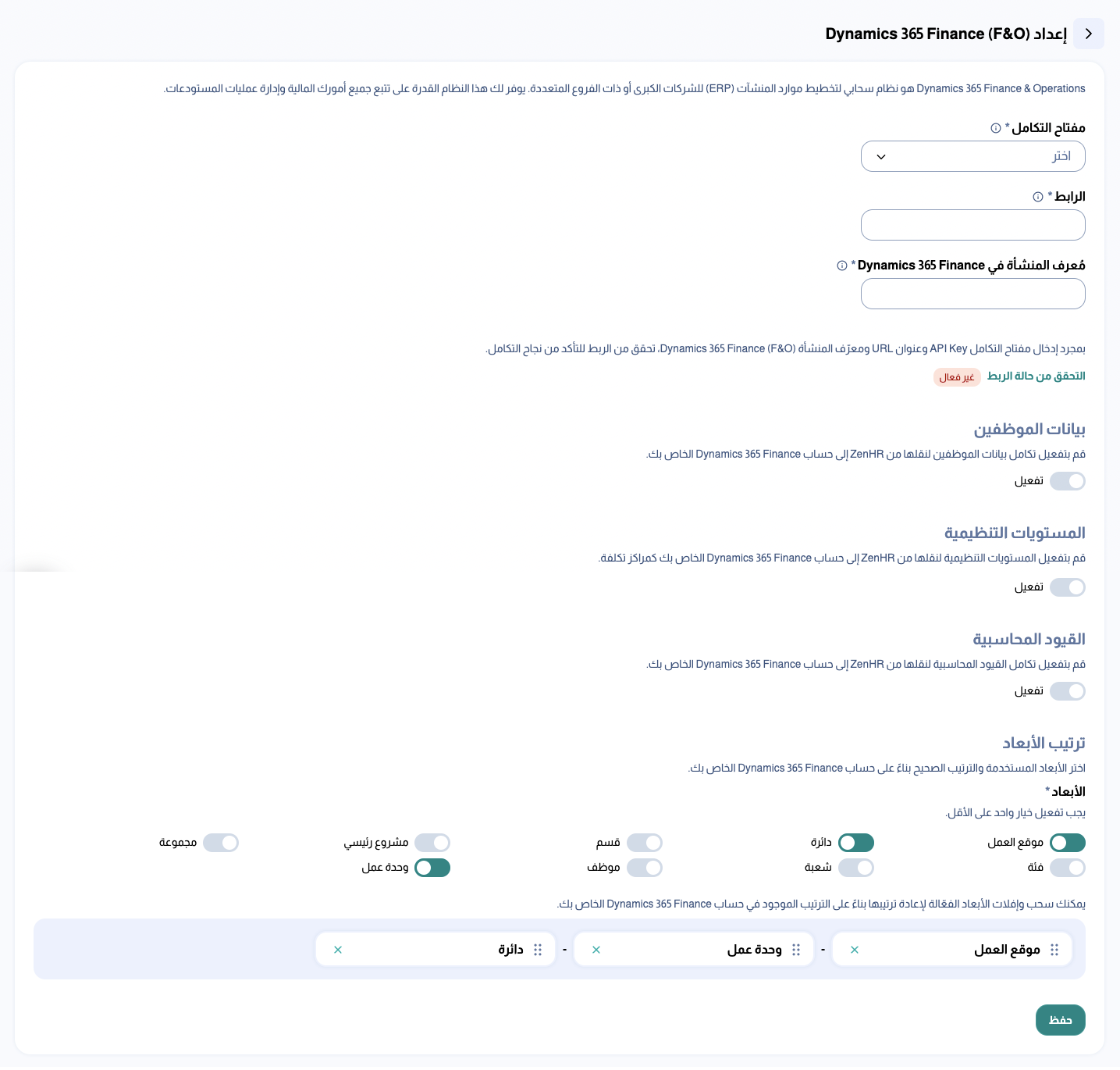 تتيح لك الصفحة الجديدة إعداد Dynamics 365 Finance & Operations ربط حساب ZenHR الخاص بك مع Dynamics 365 Finance & Operations باستخدام نوع المصادقة OAuth2. يمكنك من خلال هذه الصفحة إرسال وتحديث كافة بيانات الموظفين وإرسال القيود المحاسبية إلىDynamics 365 Finance & Operations من خلال رابط تقوم بإضافته إلى صفحة التهيئة.