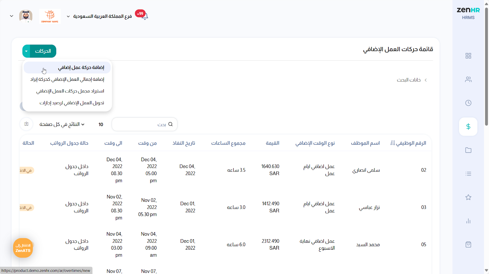 سيحسب ZenHR تلقائياً مجموع ساعات العمل الإضافي ويعرضها.