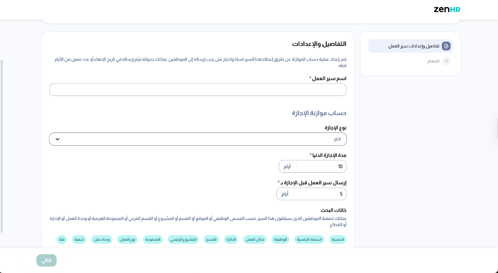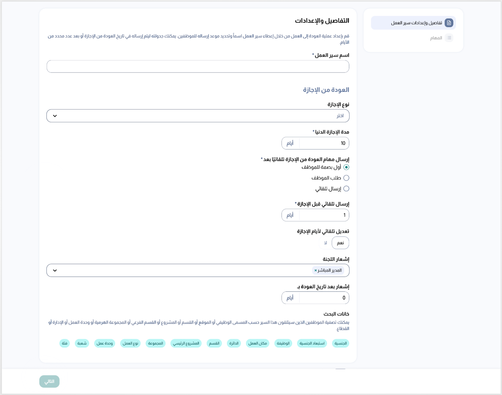 هذه الإعدادات تساعد في ضمان تشغيل سير العمل فقط عند الحاجة ولنوع الإجازة المناسب.