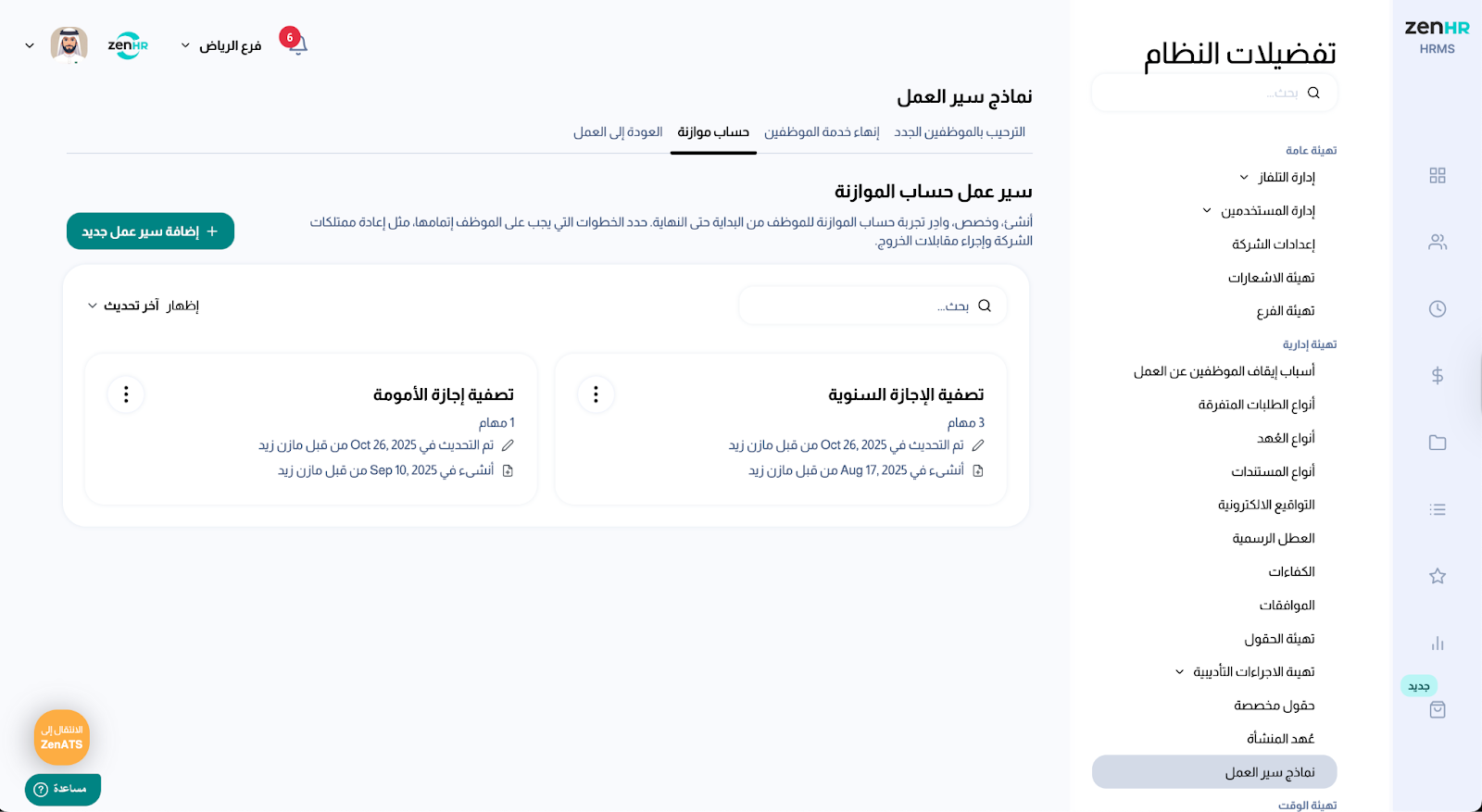 في هذه الصفحة، يمكنك عرض وإنشاء وتعديل مسارات العمل التي يتم إرسالها تلقائياً للموظفين، وتهدف هذه المسارات إلى التأكد من استكمال الموظف لجميع المتطلبات قبل بدء الإجازة، مثل إنهاء المهام المعلّقة، إعادة العُهد، والحصول على الموافقات، مما يضمن عملية واضحة ومنظّمة وسهلة للجميع.