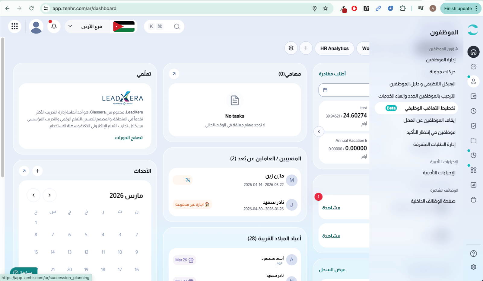 ميزة تخطيط التعاقب الوظيفي في ZenHR هي أداة لإدارة المواهب تساعد المنشآت على الاستعداد للمستقبل من خلال تحديد وتطوير الموظفين القادرين على شغل المناصب الحيوية عند الحاجة.