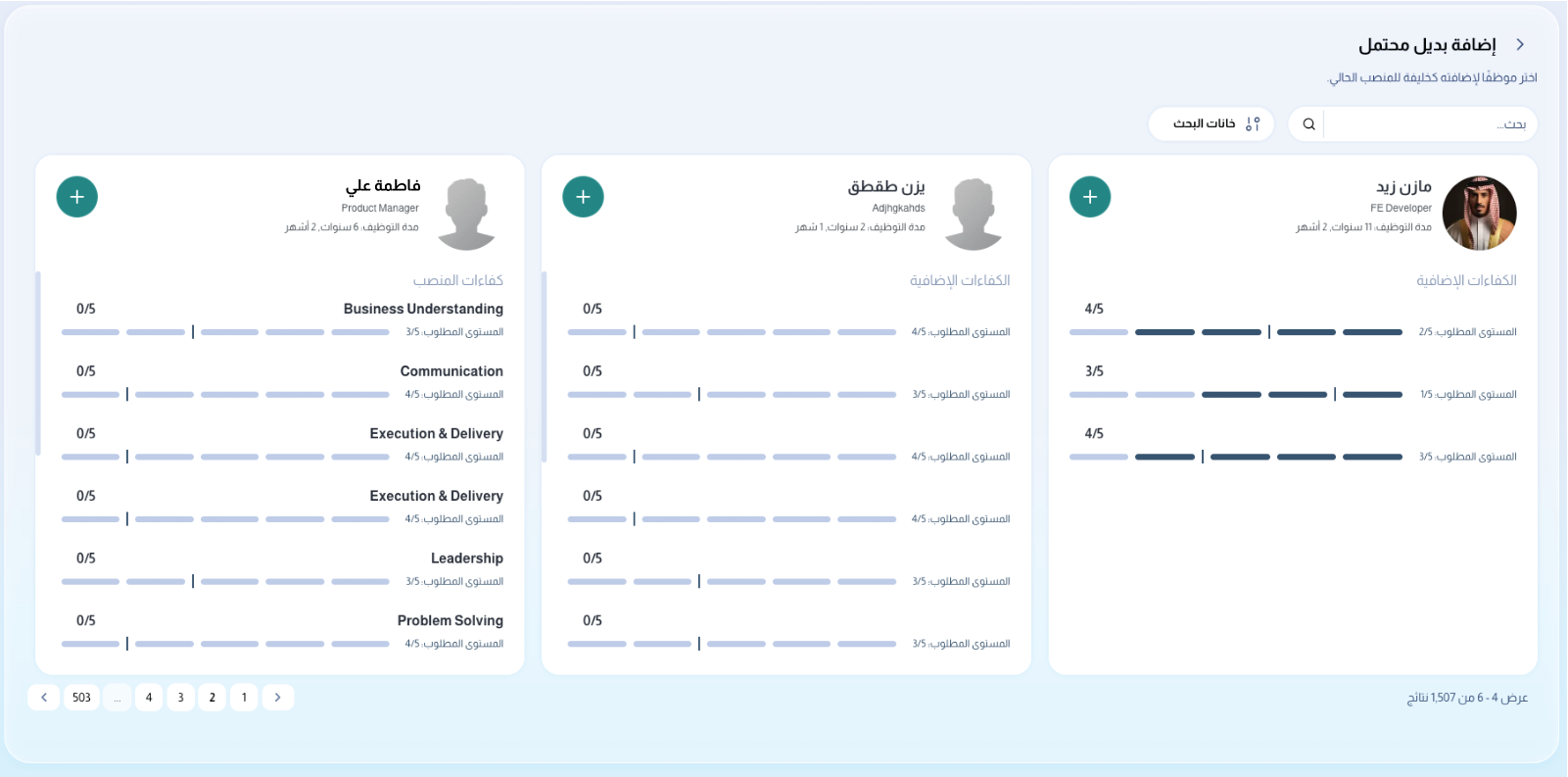 بعد ذلك، يمكنك البحث وتصفية الموظفين داخل النظام لاختيار البديل الذي ترغب في إضافته. يتيح لك ذلك ترشيح موظفين بناءً على تقييمك الخاص أو احتياجات العمل، حتى وإن لم يكونوا ضمن التوصيات المُنشأة بواسطة الذكاء الاصطناعي.