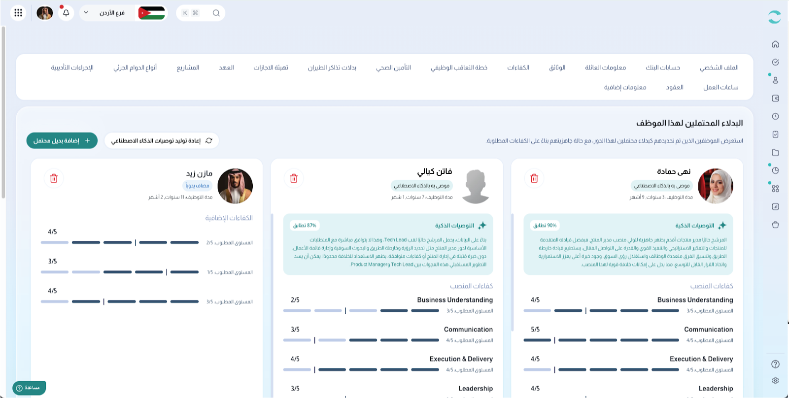 من خلال هذا التبويب، يمكنك عرض وإدارة وتحديث البدائل المحتملة المعيّنة للموظف في مكان مركزي واحد، مما يتيح لك متابعة مستوى الجاهزية، مراجعة التوصيات، وإجراء التعديلات عند الحاجة بكل سهولة.