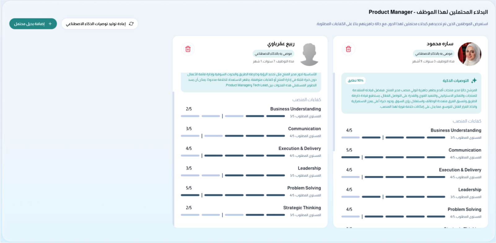 وفي حال إجراء أي تعديل على كفاءات المنصب، يمكنك طلب تحديث التوصيات من ZenAI عبر الضغط على إعادة توليد توصيات الذكاء الاصطناعي، لضمان أن تعكس البدائل المقترحة أحدث متطلبات الكفاءات.