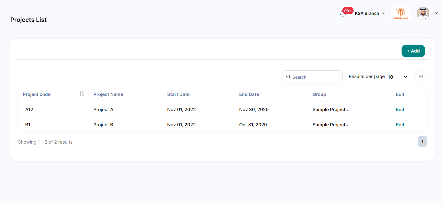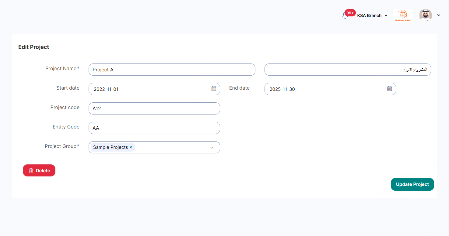 Through this page, you will be able to define the company project groups to be able to add related projects to it as shown in the below figure.