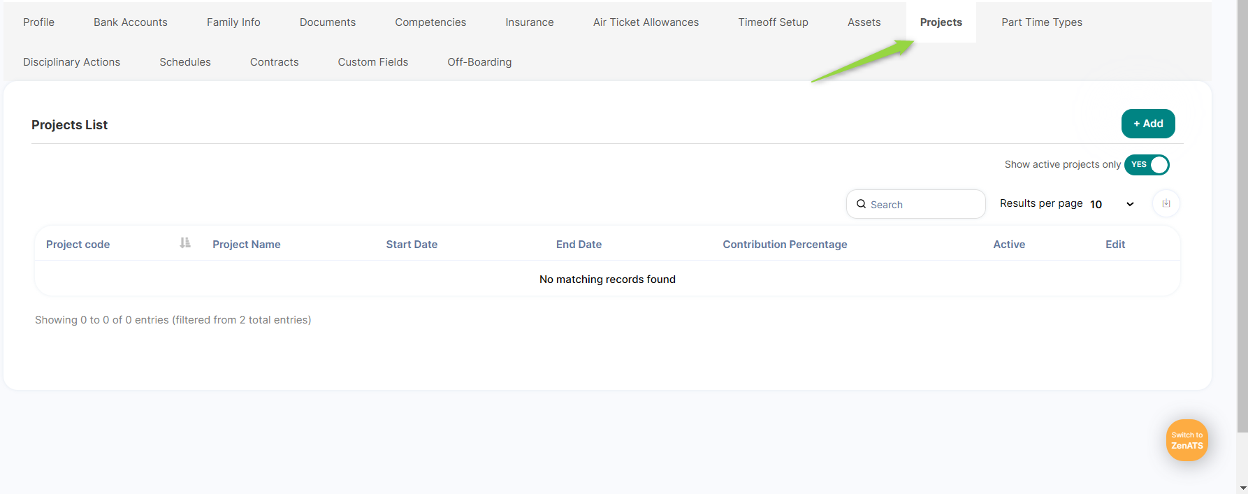 Main Menu à Employees à Employees Management à Open Employee's Profile à Projects