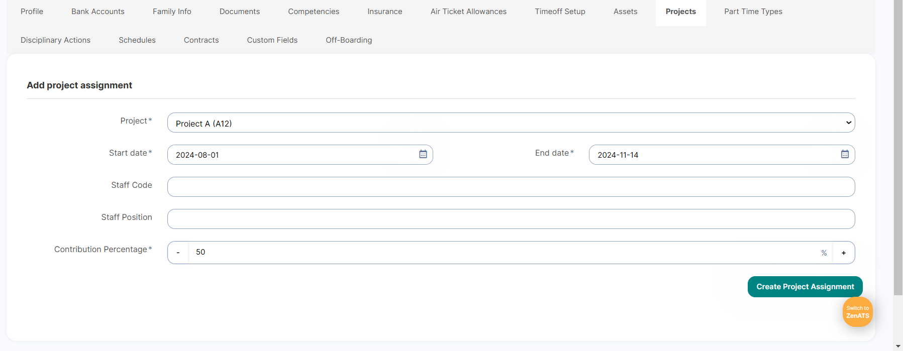 Through this page, you will be able to add employee projects and distribute his working hours on the projects by adding the percentage.