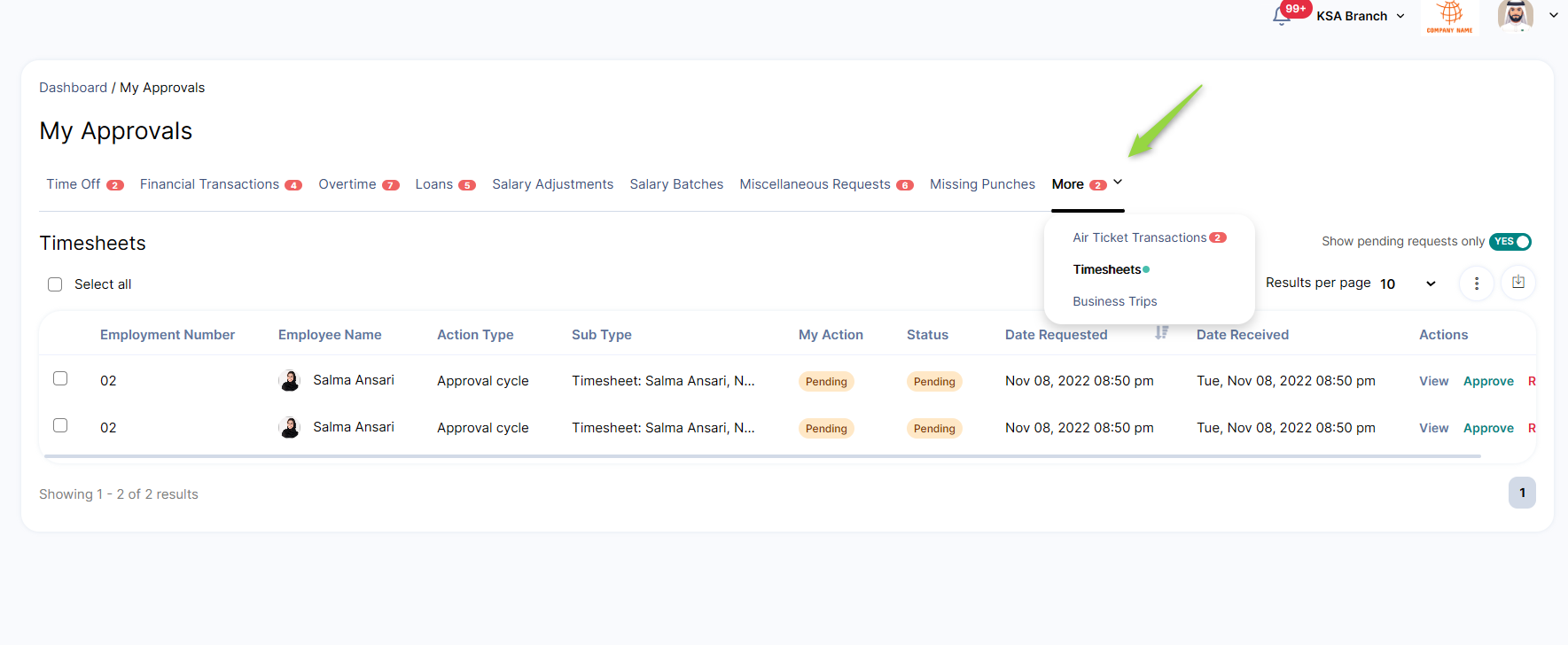 Employee's Dashboard à My Approvals à Timesheets Tab