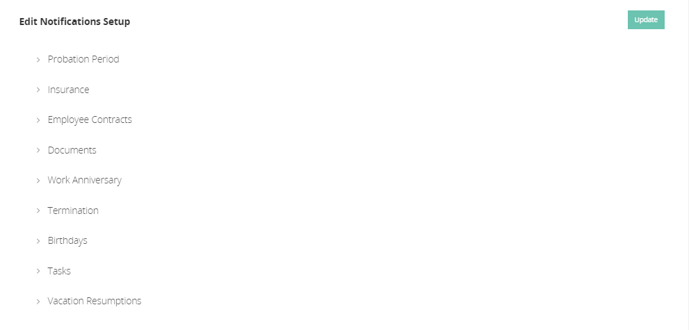 Notifications Setup allows HR admins to set up notifications, assign who will receive them and when.