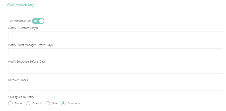 - In certain types like work anniversaries and birthdays, you will find an extra option; that allows you to decide if the employee’s colleagues will receive an email or not and who will receive it.