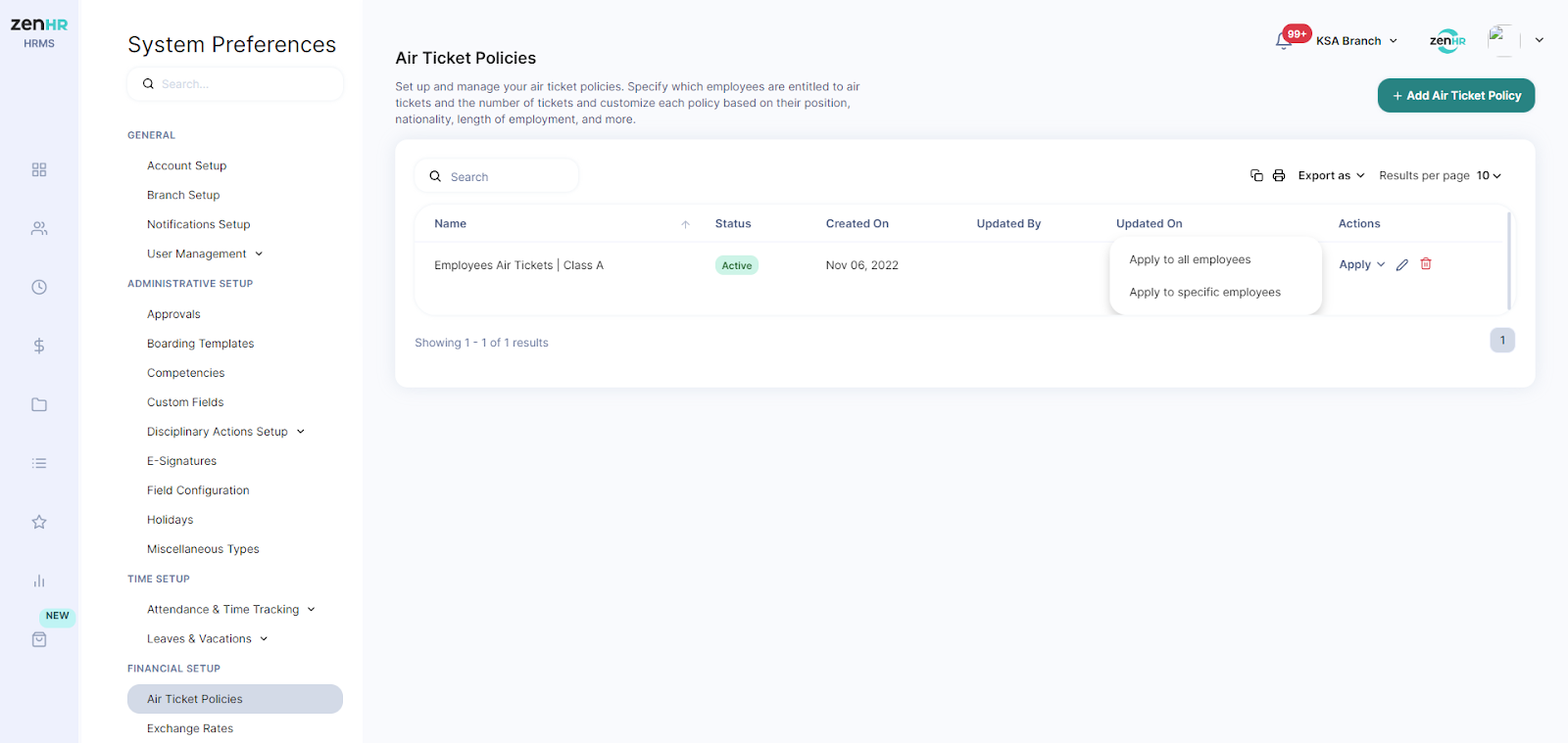 There are two ways you can apply air tickets to employees, either through the “Apply” button on the Air Ticket Policies page or through the employee profile in the Air Ticket Allowances tab.