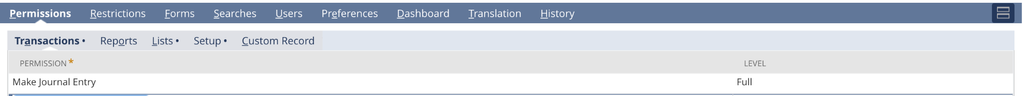 - From the Transactions, make sure that the user has full permission to Make Journal Entries.