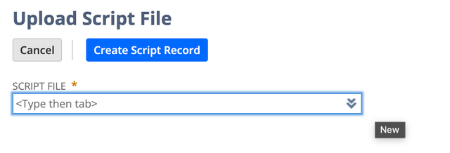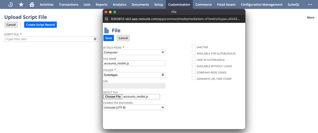 Upload the scripts from your computer, make sure that the script name ends with .js and select the folder SuiteApps.