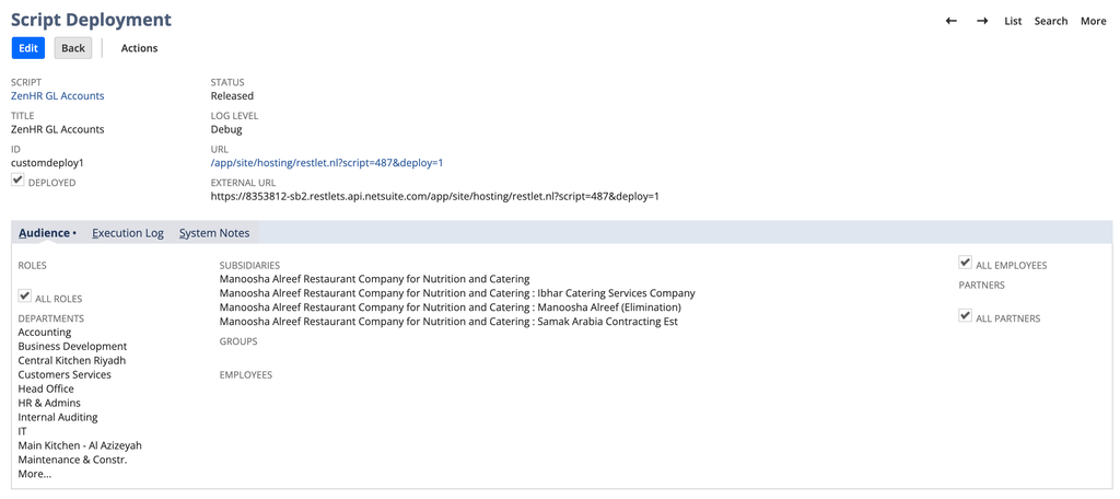 Ensure that the script has access to all roles, subsidiaries, employees, and groups by pressing on Edit then selecting all of them. The script is now prepared for utilization by ZenHR. You will simply need to copy the External URL for inclusion in the NetSuite integration setup on ZenHR.