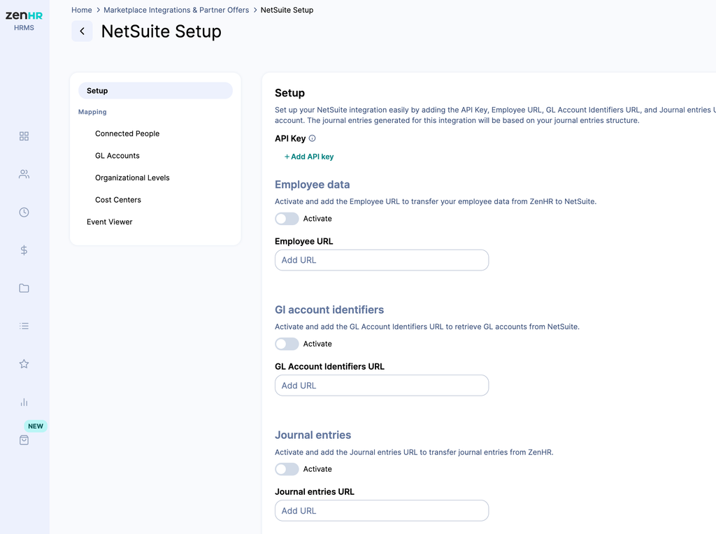 Important Note: Prior to enabling the integration for employees, it is crucial to ensure that the NetSuite internal ID of each employee is recorded in ZenHR under Marketplace Integration → NetSuite Setup → Connected People.