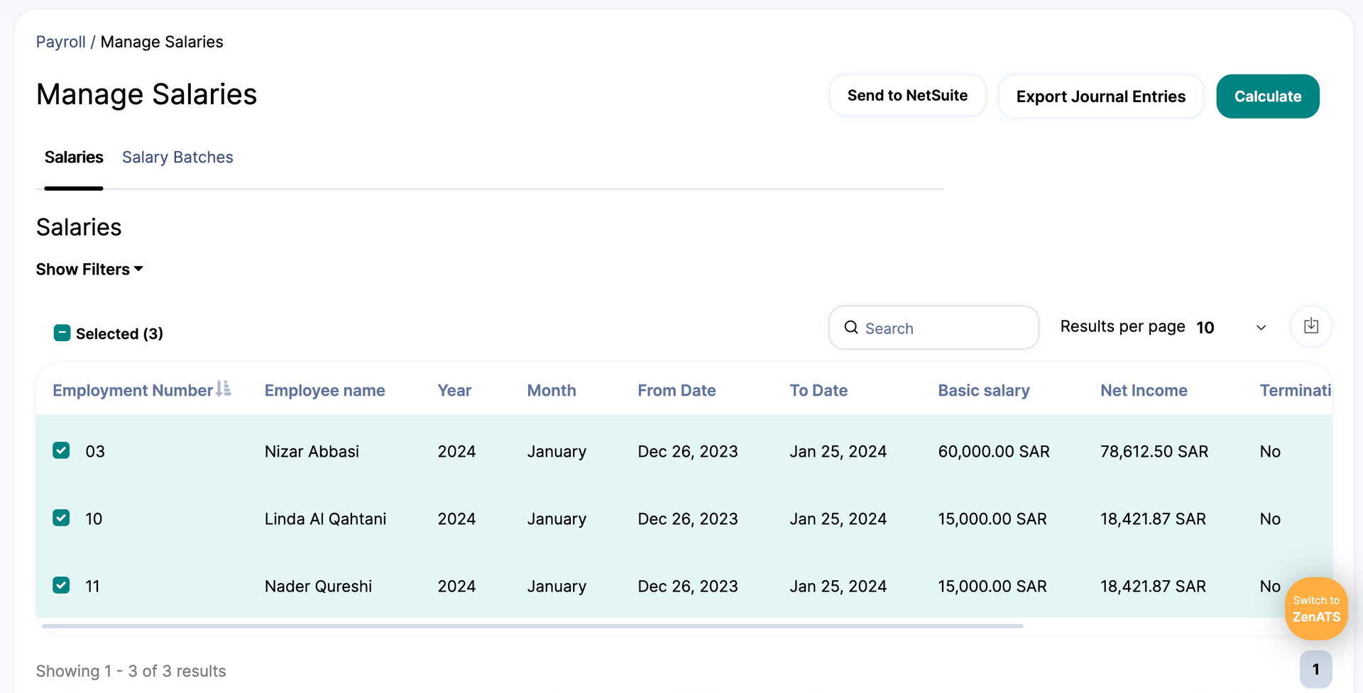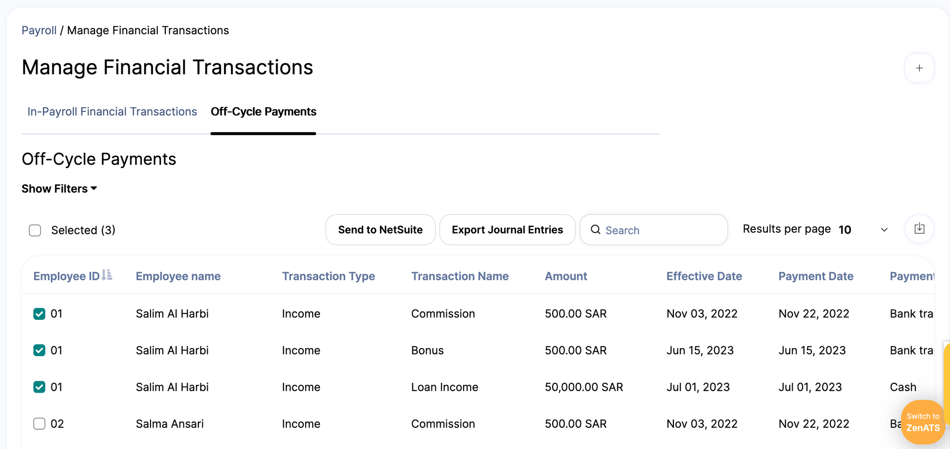 Now whenever You post salaries from ZenHR to NetSuite, and Off-Cycle Payments and Vacation In-Advance Salaries will be sent as separate journals.Manually Generate Off-Cycle Payments journal entries