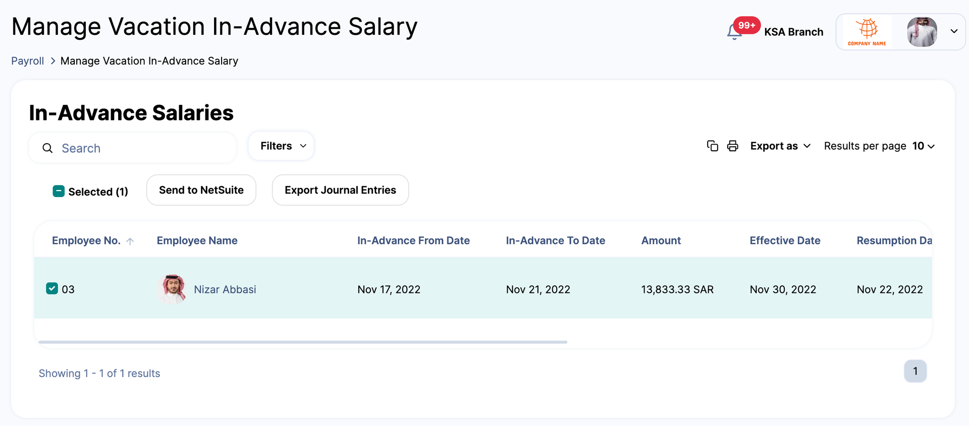 Then click “Send to NetSuite”, and your off-cycle vacation in-advance salaries will be transferred as journals.