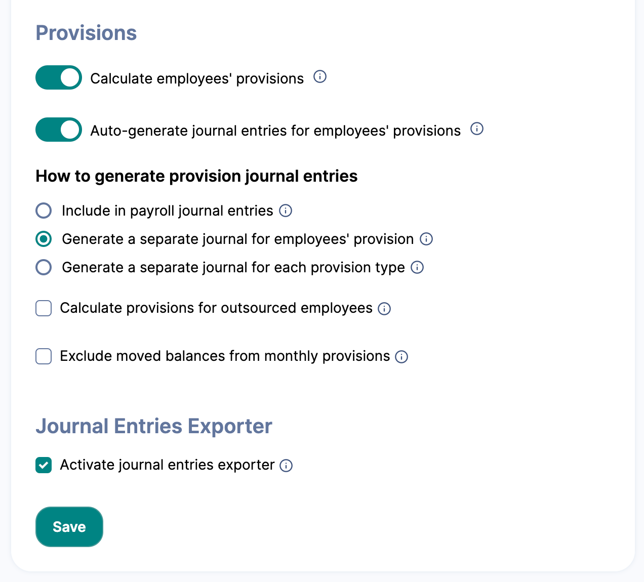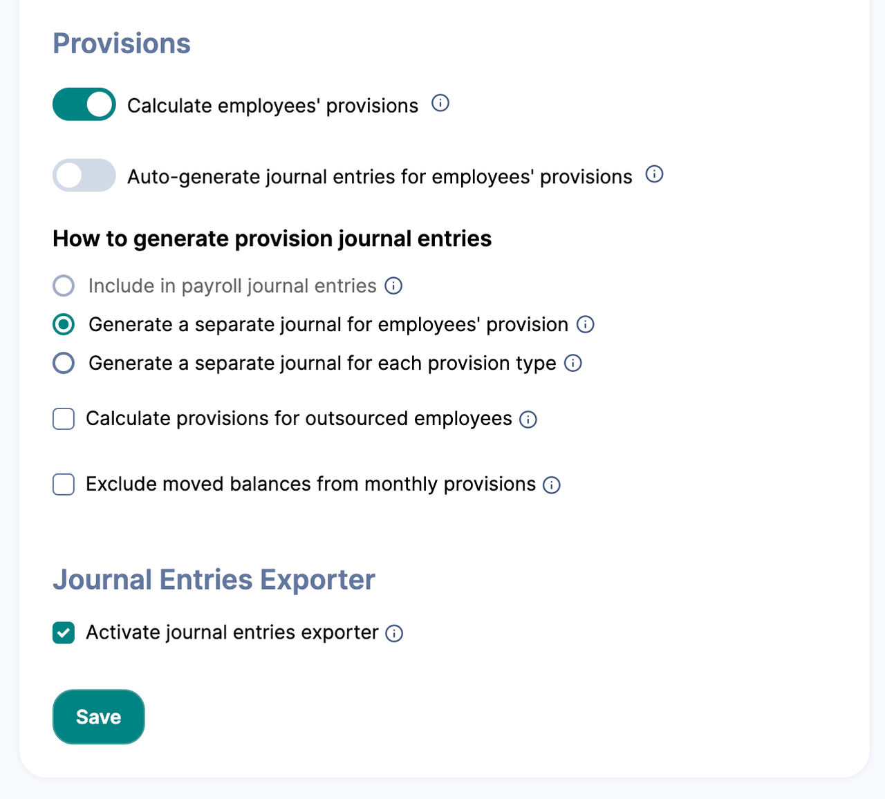 Activate the Auto-generate journal entries for employees' provisions toggle.
