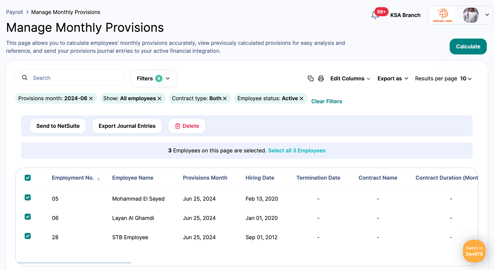 Upon activating the integration, you will be able to transfer journal entries for salaries, off-cycle financial transactions, employee settlements, company contributions, expenses, and provisions from ZenHR to your NetSuite account.
