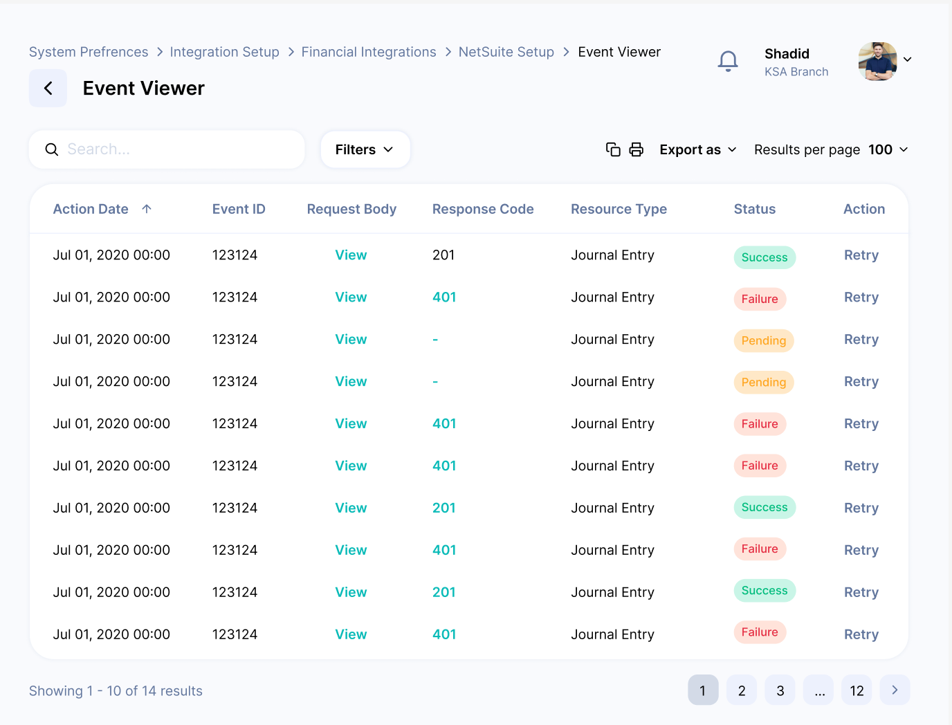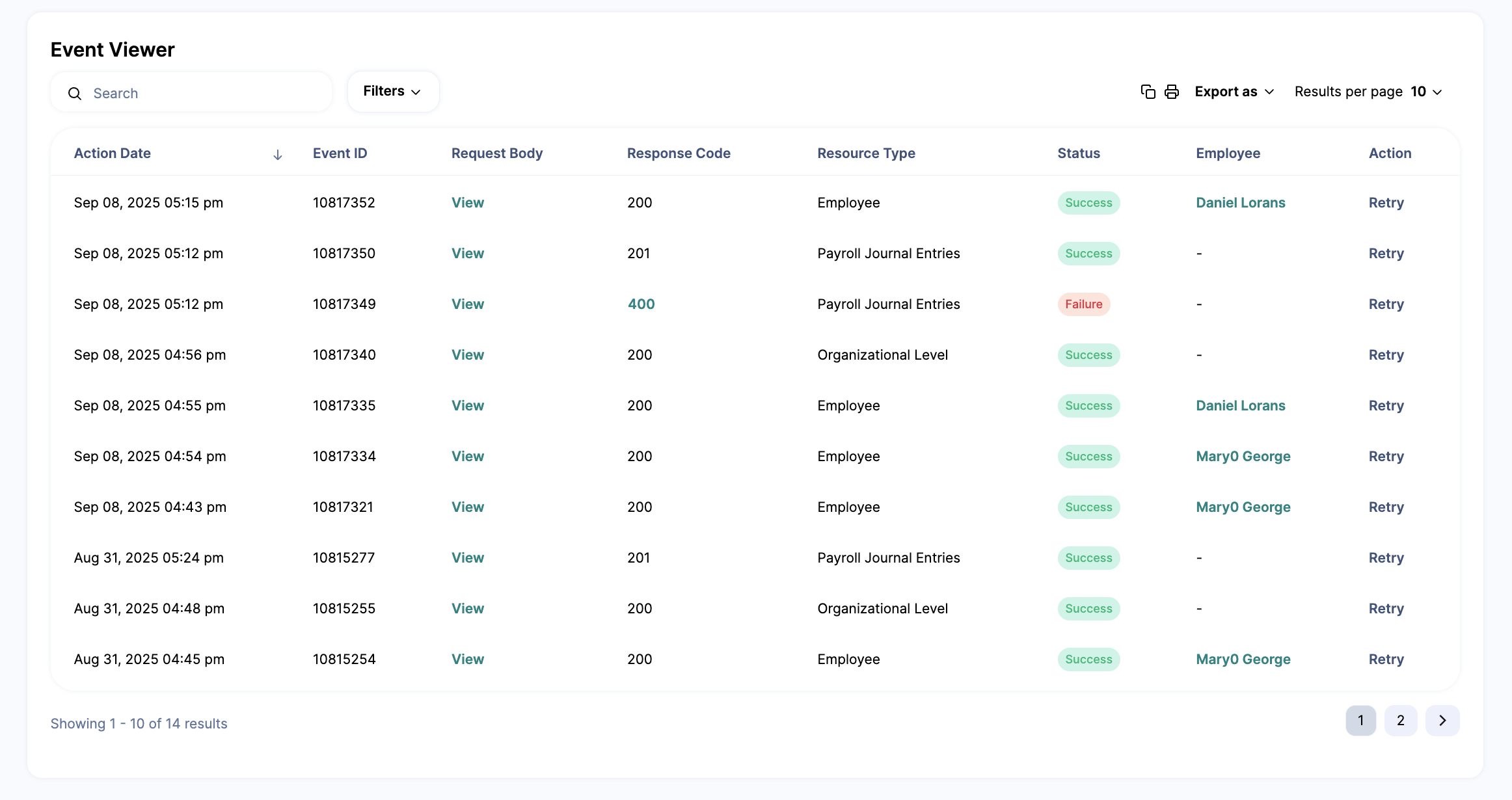 Just as with any integration between two platforms, having a monitoring tool is essential to oversee all events and activities. This tool plays a crucial role in tracking the outcomes of these events efficiently, which can be achieved through the NetSuite Events Viewer on ZenHR.
