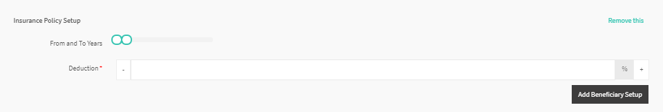 This setup enables Admins to add slices of insurance policies. Admins can also add the company policy with regards to the employment duration and employee charges. For instance, employees that have worked for the company between 0-3 years will have 100% deduction, meaning that they will be charged the total amount of the Adult and Minor costs. Admins are not restricted to a certain number of slices. By clicking Add Beneficiary Setup, Admins can add the company policy for family members within that particular slice, as shown in the picture below: