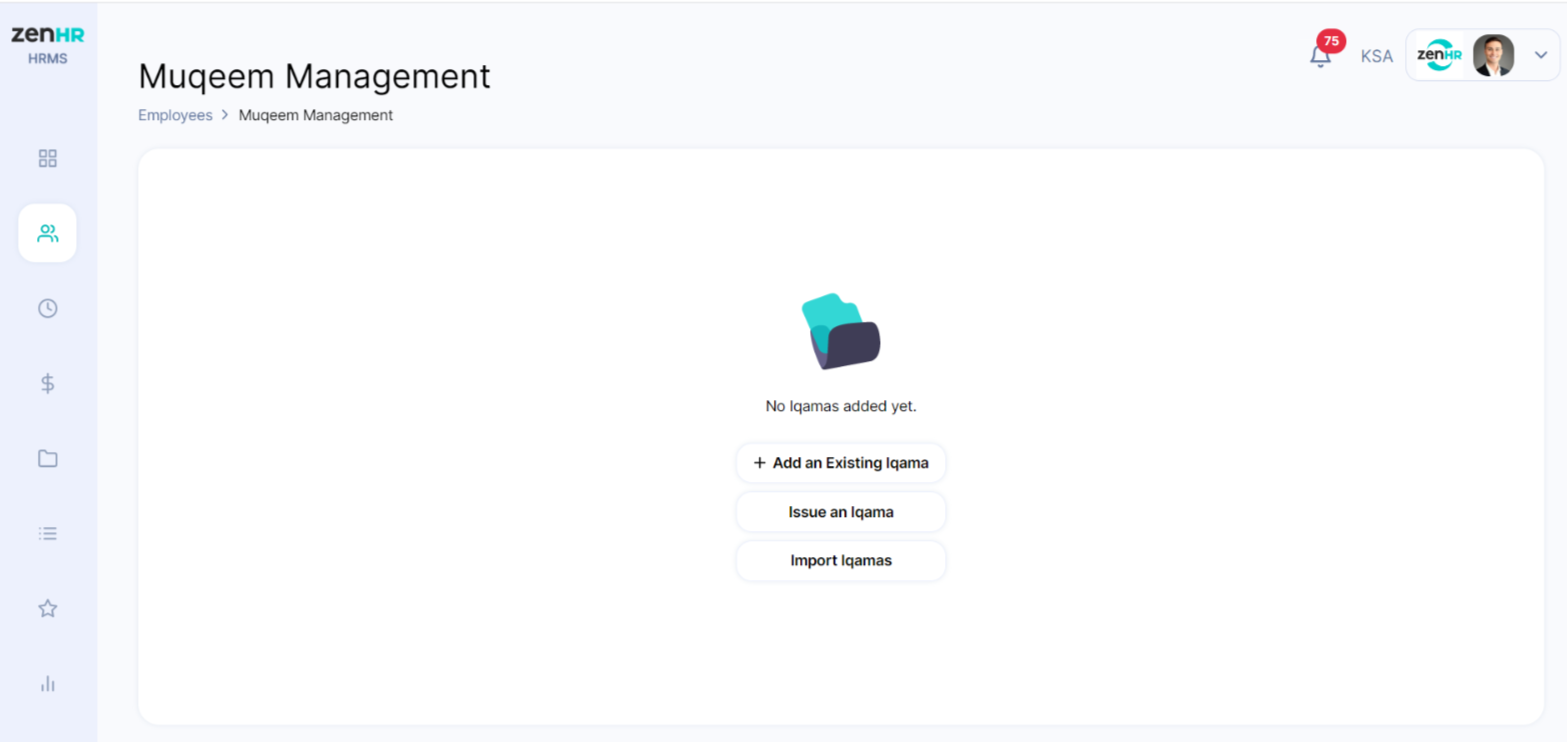 On the Muqeem Management page, if no Iqamas have been added, you can Add an Existing Iqama, Issue an Iqama or Import Iqamas.