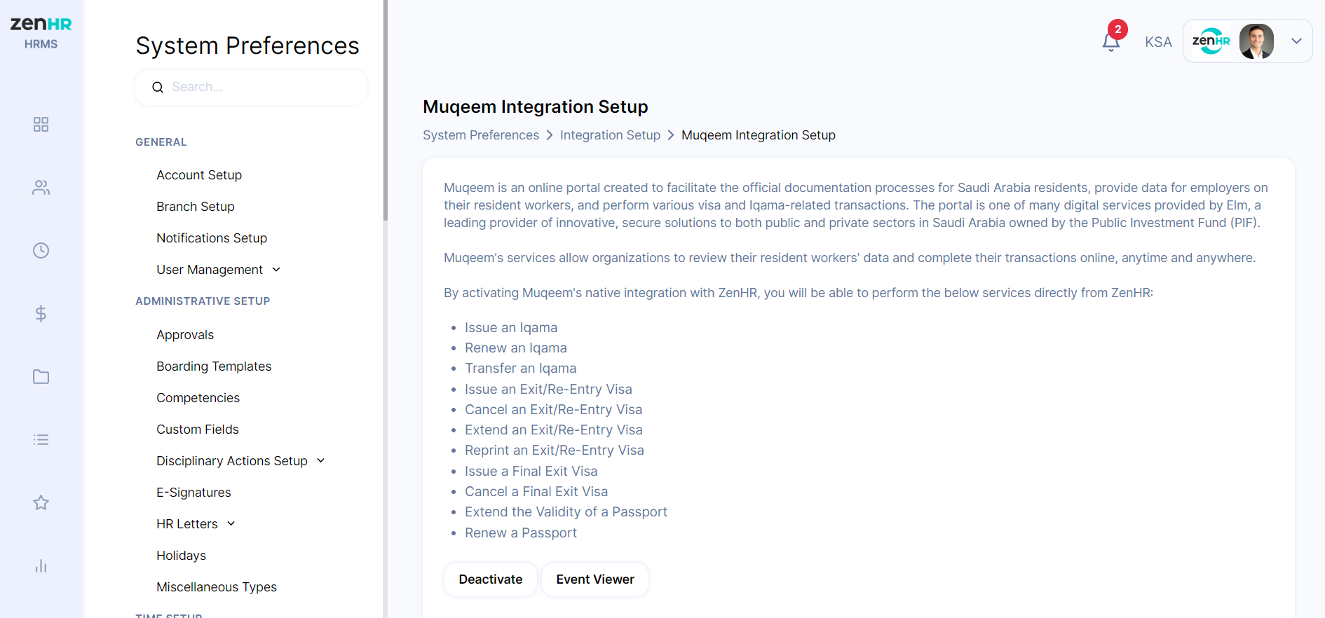 On the Muqeem Integration Setup page, Muqeem integration must be activated on ZenHR in order to be able to perform any actions. This action can only be performed by the Superadmin.
