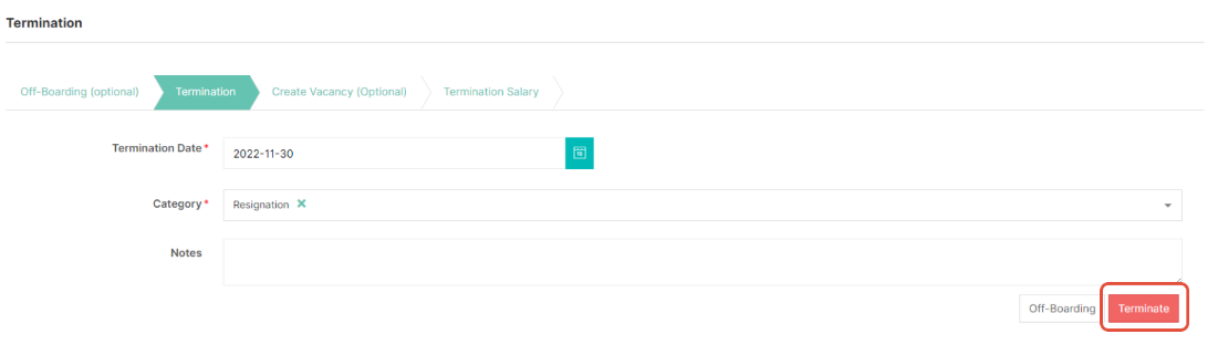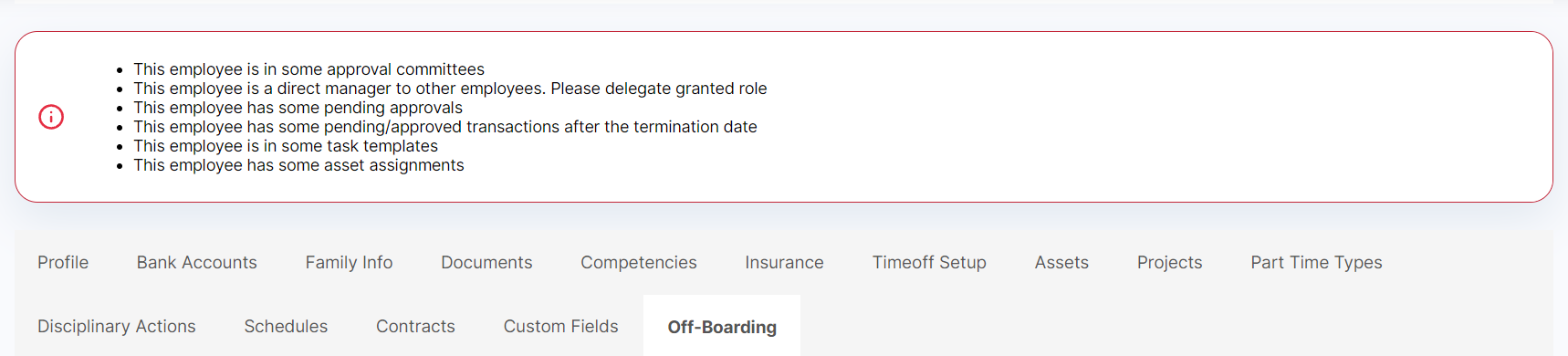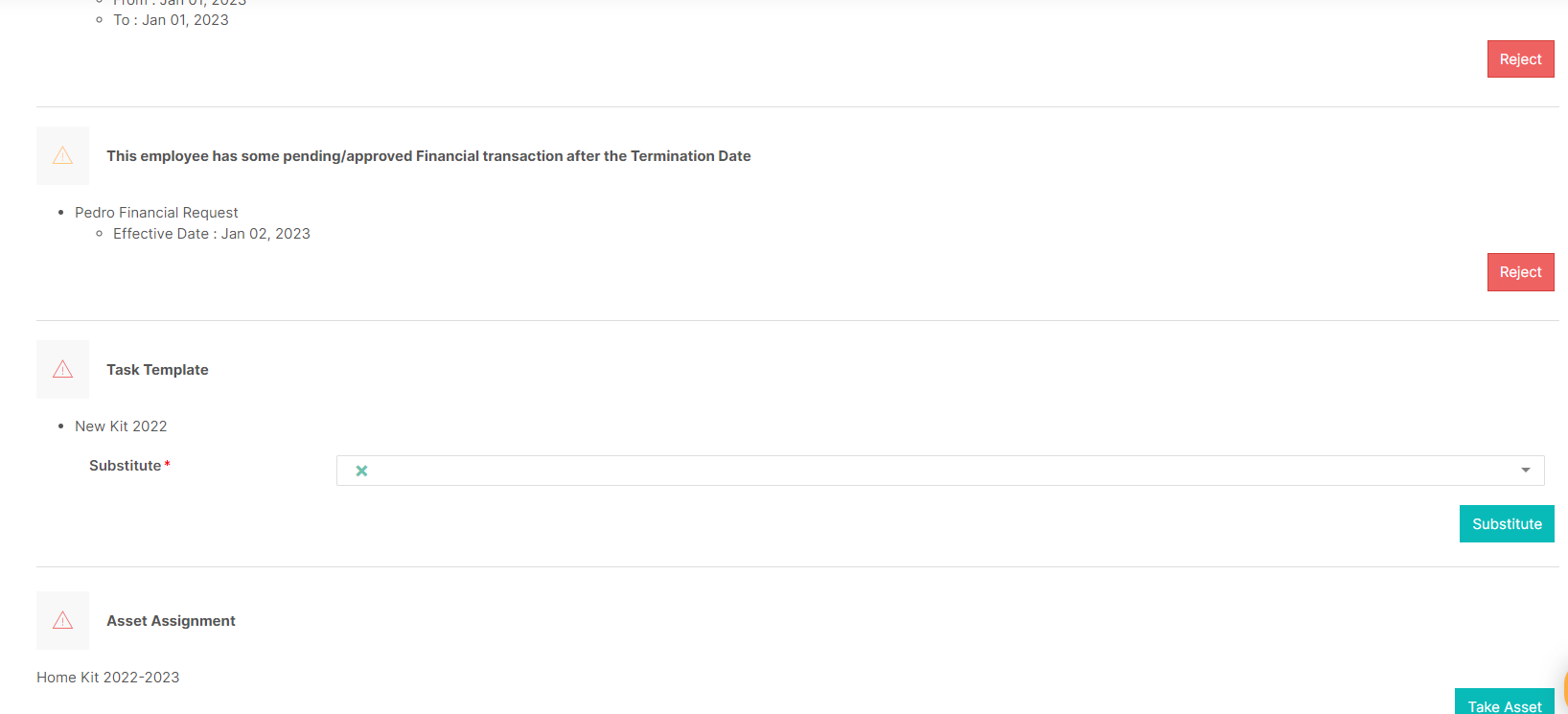 After submitting these details, the system will run a background check to identify any pending items that need to be resolved before the termination can be completed. This ensures all outstanding tasks, assets, or approvals related to the employee are addressed.