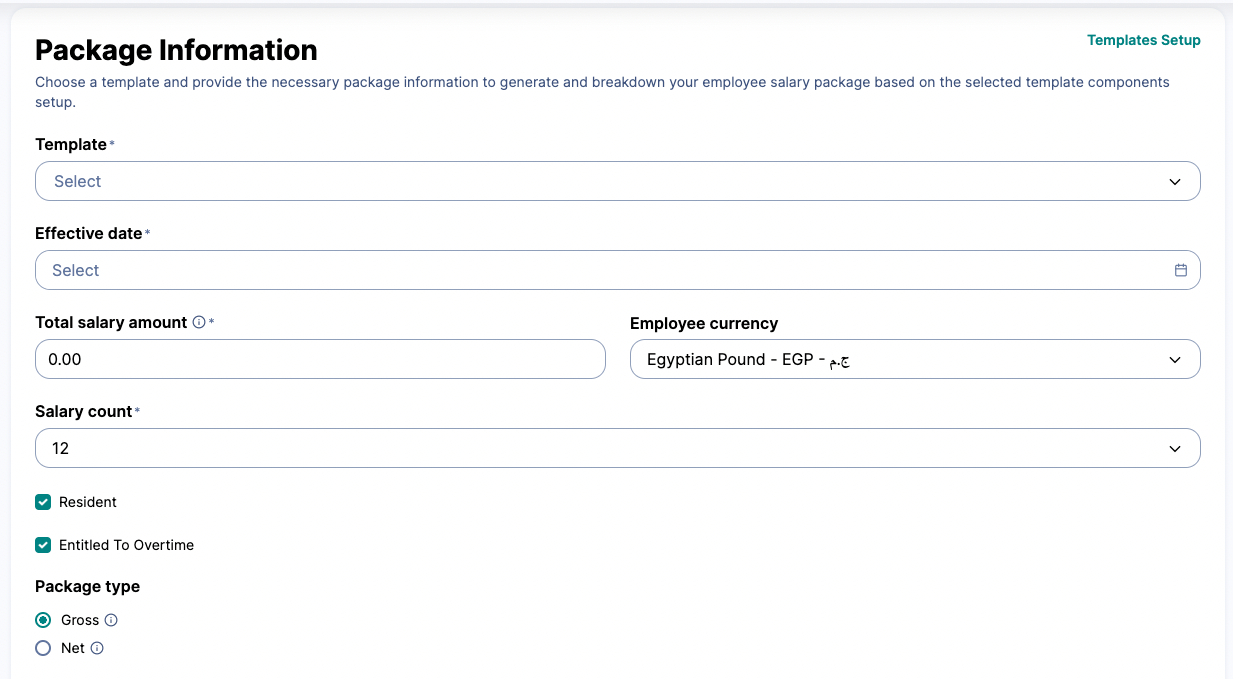 To edit the breakdown templates, click on the "Templates Setup" button. This will redirect the admin user to the Salary Packages Template setup page.
