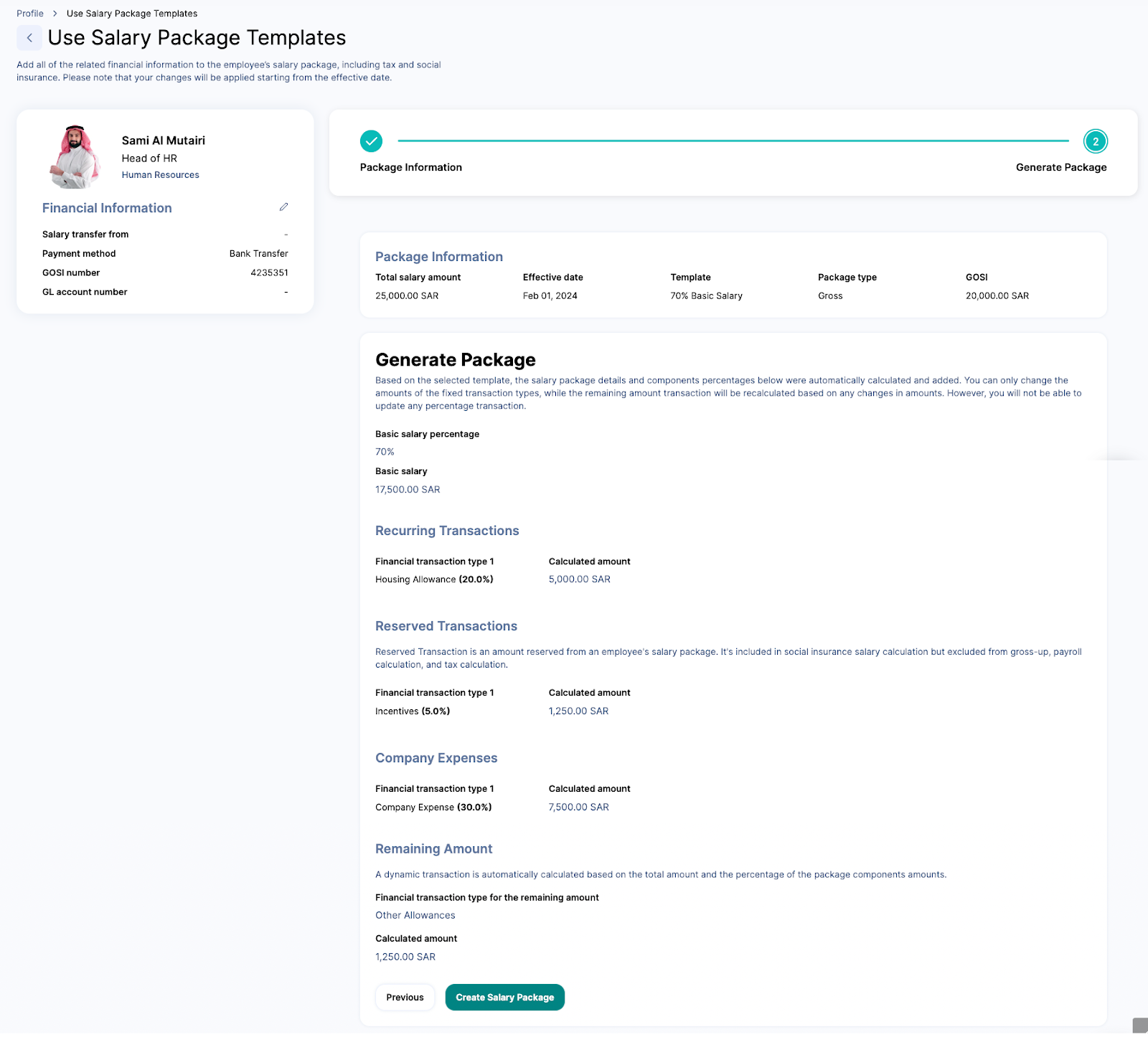 The admins can select the template that they want to use from the related Template dropdown list, which will show only the active templates. Admins can then choose the effective date, insert the net/total salary of the employee, select the package type, insert the social insurance salary, and indicate whether or not the employee is taxable. They can also add any exemptions for the employee.