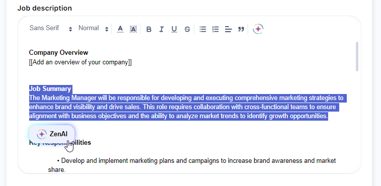 ZenAI automatically generates a job description for the vacancy you are creating based on the information you have added above.