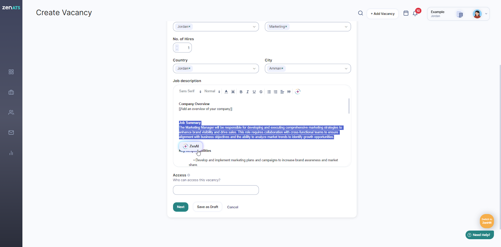 When creating a new job vacancy on ZenATS, you can utilize ZenAI to write job descriptions for you. To use ZenAI for generating a job description, follow these steps: