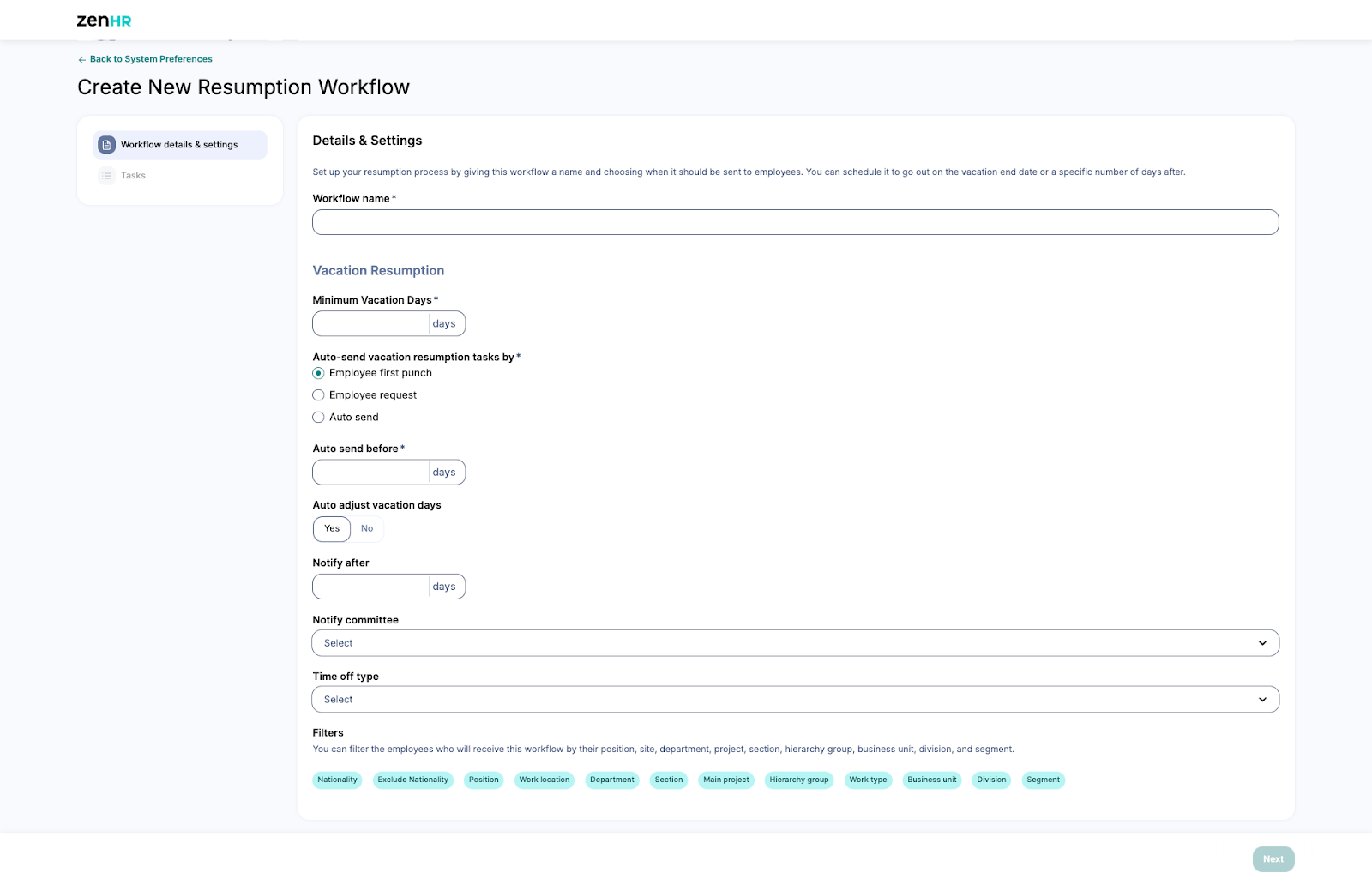 Minimum Vacation Days: Set the minimum number of vacation days that will trigger the resumption workflow.