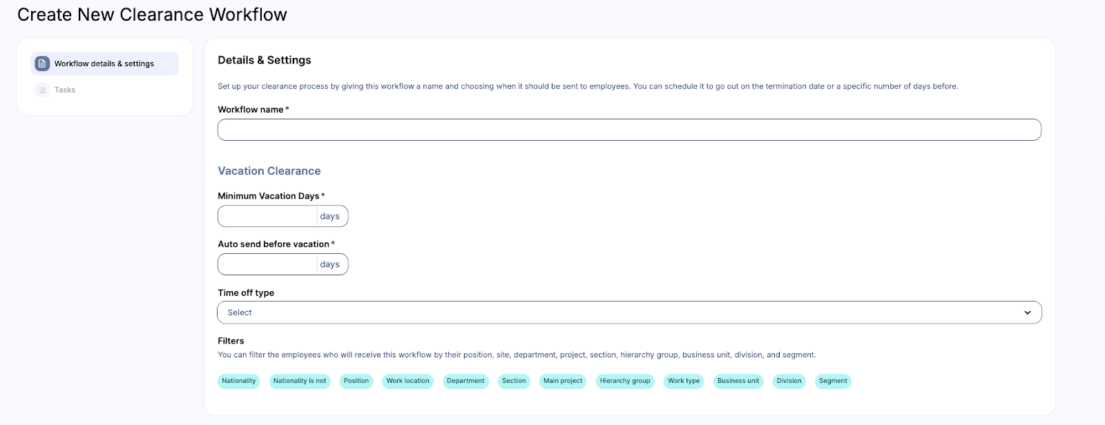 On this page, you can view, create, and edit Vacation Clearance workflows that are automatically sent to employees.