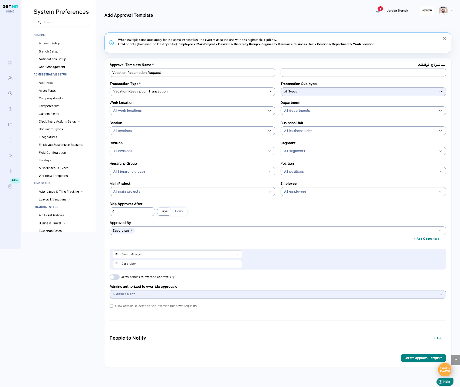 You can also define approval cycles for the Vacation Resumption process through the Approval Cycle page in System Preferences. This ensures that each resumption request goes through the proper approval flow before being finalized.