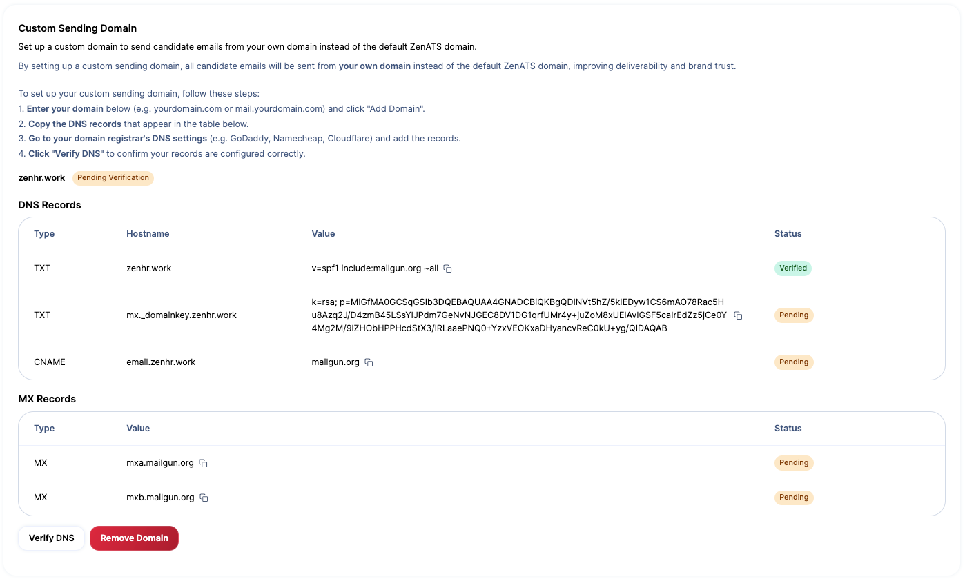 Once added, ZenATS will generate a set of DNS records. These records are required to verify that you own the domain and allow ZenATS to send emails on your behalf.