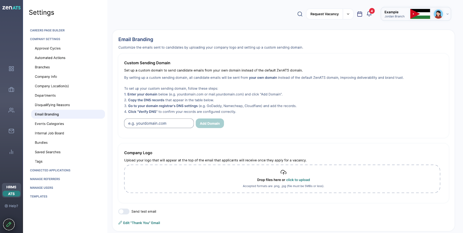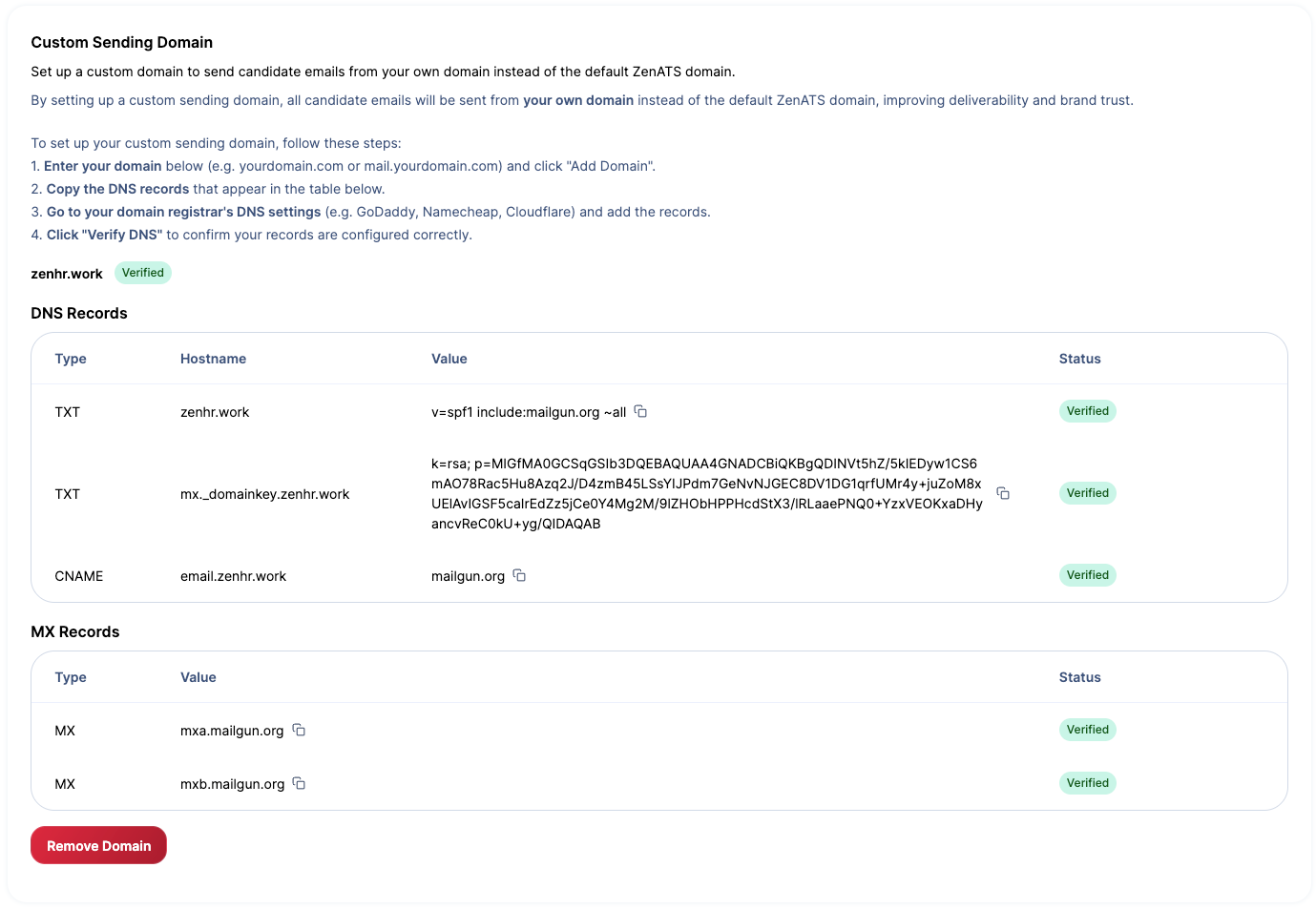 After successful verification, all emails sent through ZenATS will use your domain, creating a more seamless and professional candidate experience.